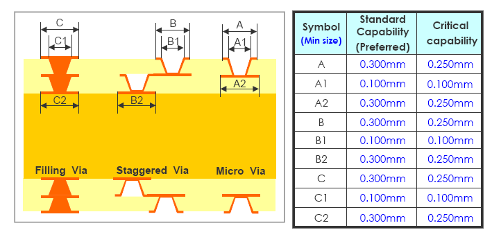 | Via Size Capacity | 200 um~ | 50~100um |