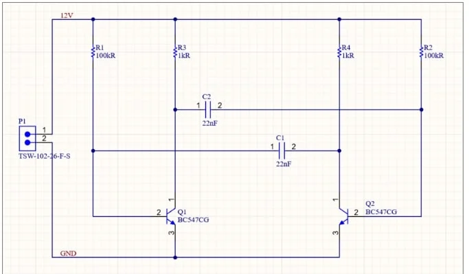 The Multivibrator circuit will be assembled using components that were obtained from Manufacturer Part Search using the Components panel. The schematic ought to resemble the picture below when the components have been assembled.