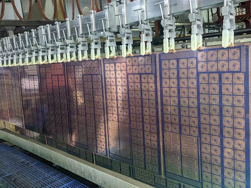 After drilling, this procedure involves applying a new layer of copper to the entire panel. It covers the nonconductive materials that were exposed following drilling and also ties the panels together. For plating, a chemical electrolysis setup is employed. To guarantee correct connection, approximately 25 microns of copper are inserted into the drill holes.