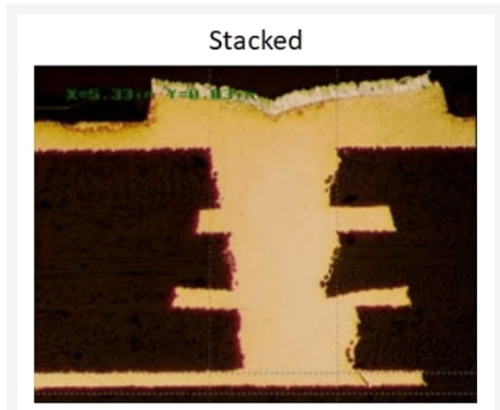 Stacked vias are created by stacking numerous vias on top of one another. To ensure an electrical connection, each via is first drilled and then metalized while keeping a small annular ring at the top and bottom. Since the annular ring is frequently quite narrow—as thin as .002′′—very precise registration is required.