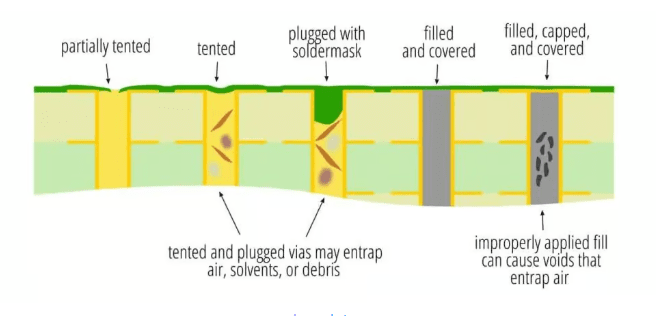 - Inappropriate filling creates gaps in vias. This can result in the generation of localized stress in the structure of PCB. This can also affect the reliability of stacked microvias.